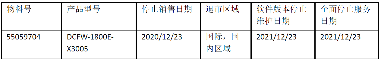 北京神州數(shù)碼leyu.樂魚信息技術有限公司正式通知您, 以上DCFW-1800E-X3005下一代防火墻(55059704)將于2020年12月23號停止接收新的訂單(具體日期見上表),不再供貨。給您帶來的不便,敬請原諒。