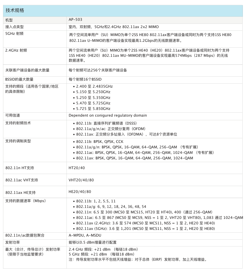 室內(nèi)中密度Wi-Fi 6接入點AP-503提供兼具高成本效益與高性能的連接,可以幫助各類組織應(yīng)對因移動使用需求提高、轉(zhuǎn)向云或物聯(lián)網(wǎng)環(huán)境而帶來的設(shè)備增長挑戰(zhàn)。503 系列的實際聚合數(shù)據(jù)速率高達(dá) 1.775 Gbps(HE80/HE40),可以為學(xué)校、中型辦公室和零售賣場等中等密度的場地和工作場所提供所需的連接速度和可靠性。